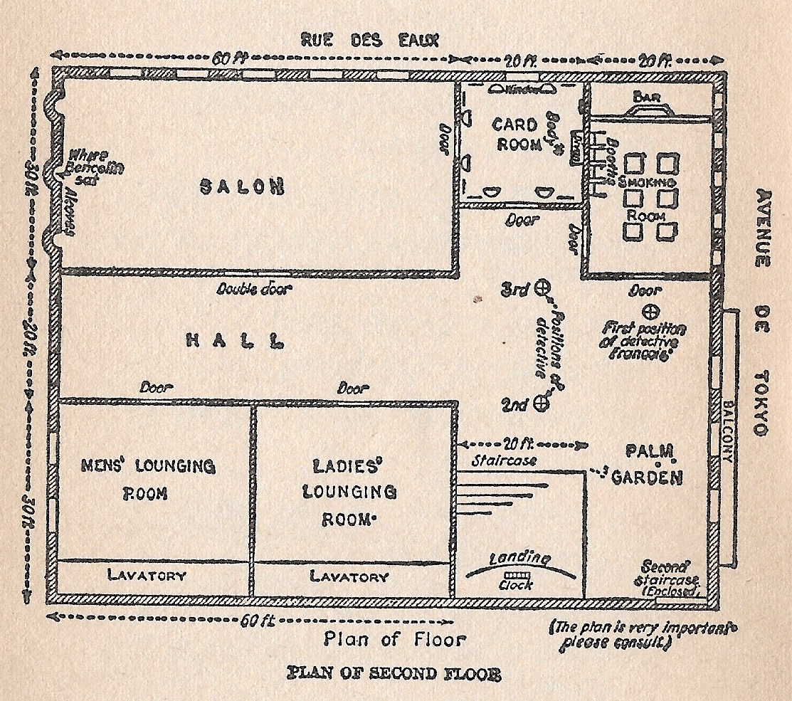 It is convenient that this Keane has decided to venture around in Paris under an assumed name, and it able to keep his name so concealed that even the courts of justice cannot pry it out of him. For, had he gone by his true name of Landervorne, we would not have much of a mystery here. Marle reminds us in Chapter 6 that Bencolin had, in Chapter 1, mentioned the dead man in Egyptian robes with a bullet through his head. There, he calls it “one of the strangest crimes” he ever knew. We are given an early indication of Sir John’s relation to the matter when, after Bencolin mentions the subsequent suicide of the Englishman, a “flush” rises under Sir John’s cheekbones and he sits “curiously rigid,” an obvious sign of discomfort. But of course then, we take it as stiff Anglo-Saxon discomfort toward indulging in the lurid details of the crime (in the context of their conversation just prior comparing Anglo and Gallic types).
